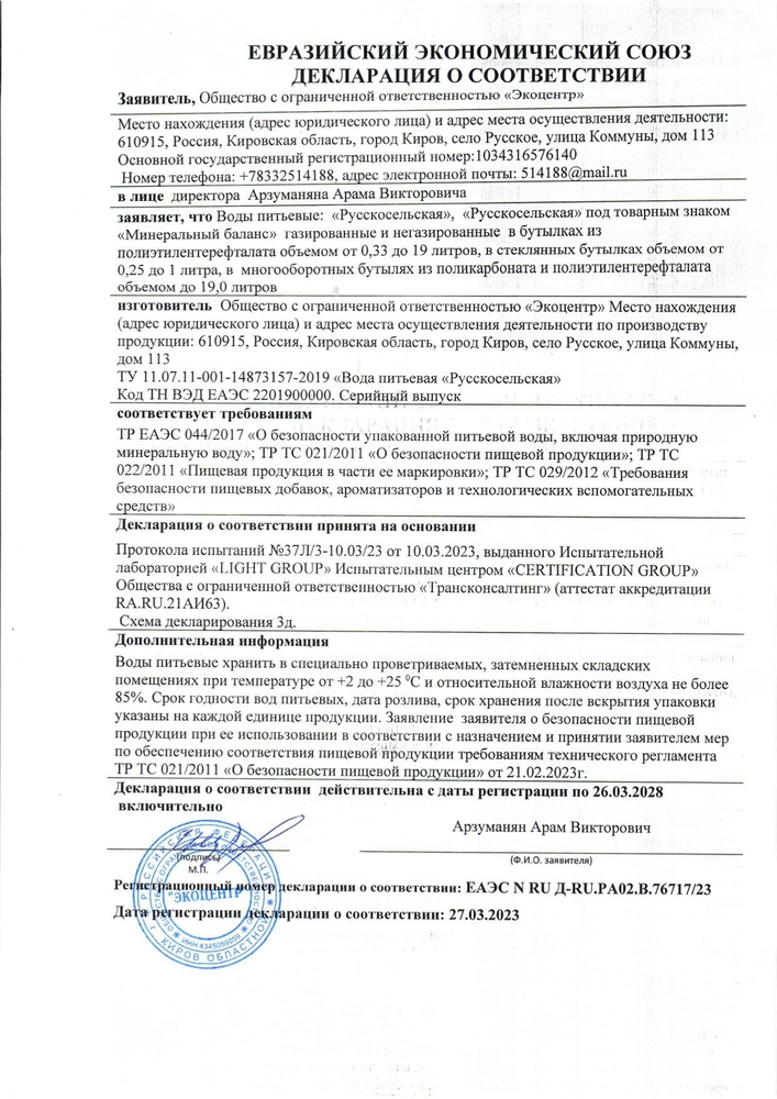 Вода ТМ "Русскосельская" имеет все необходимые документы, подтверждающие качество производимой продукции.